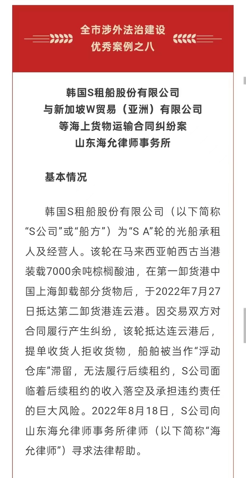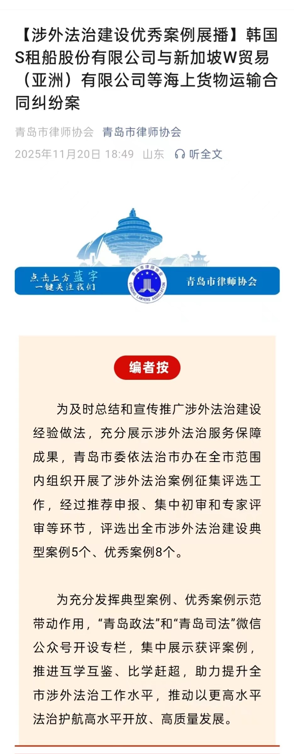 海允所承办案件入选【青岛市涉外法治建设优秀案例】