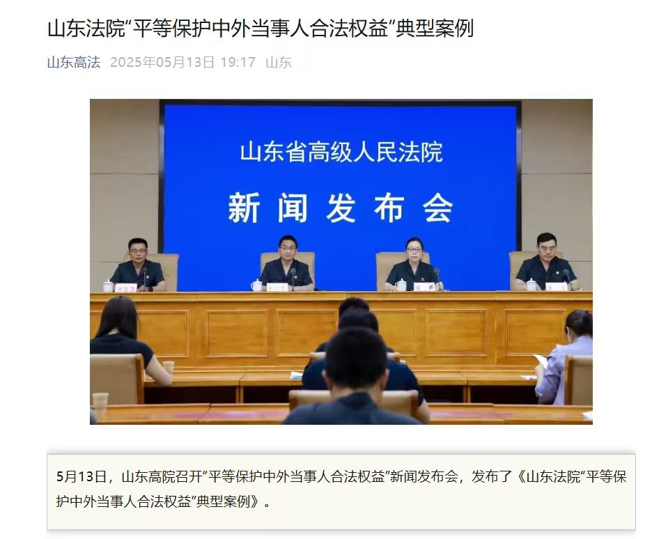 This case was selected into the "Typical Cases of Equal Protection of the Legitimate Rights and Interests of Chinese and Foreign Parties" by the Shandong High People's Court.